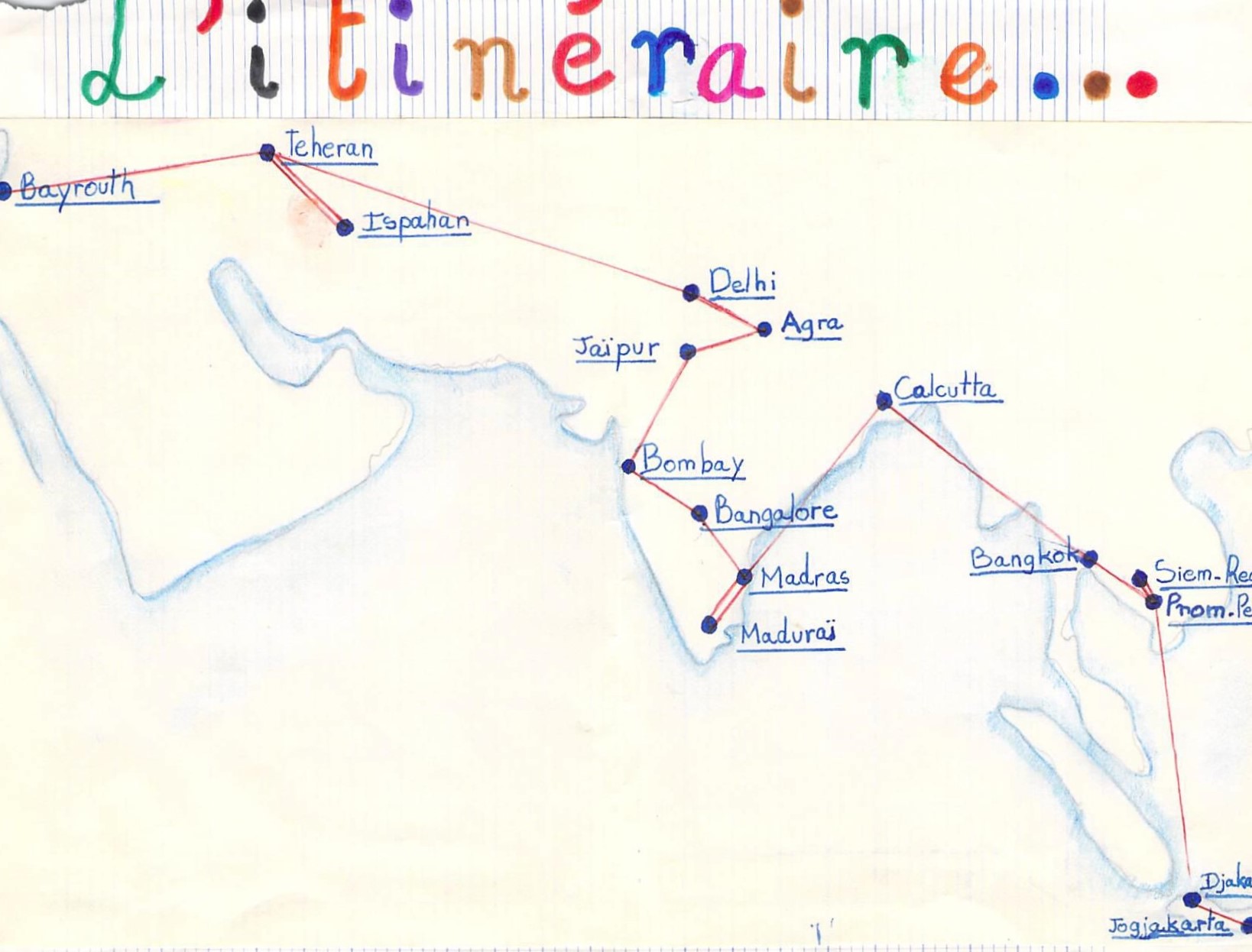 This map (drawn at the time by Madeleine) shows the itinerary of our travels in the summer of 1969 (June 23 - July 30) from Indonesia to Lebanon, via Cambodia, Thailand, India, and Iran. One can be sure Verne packed in as much sightseeing as he possibly could along the way!
